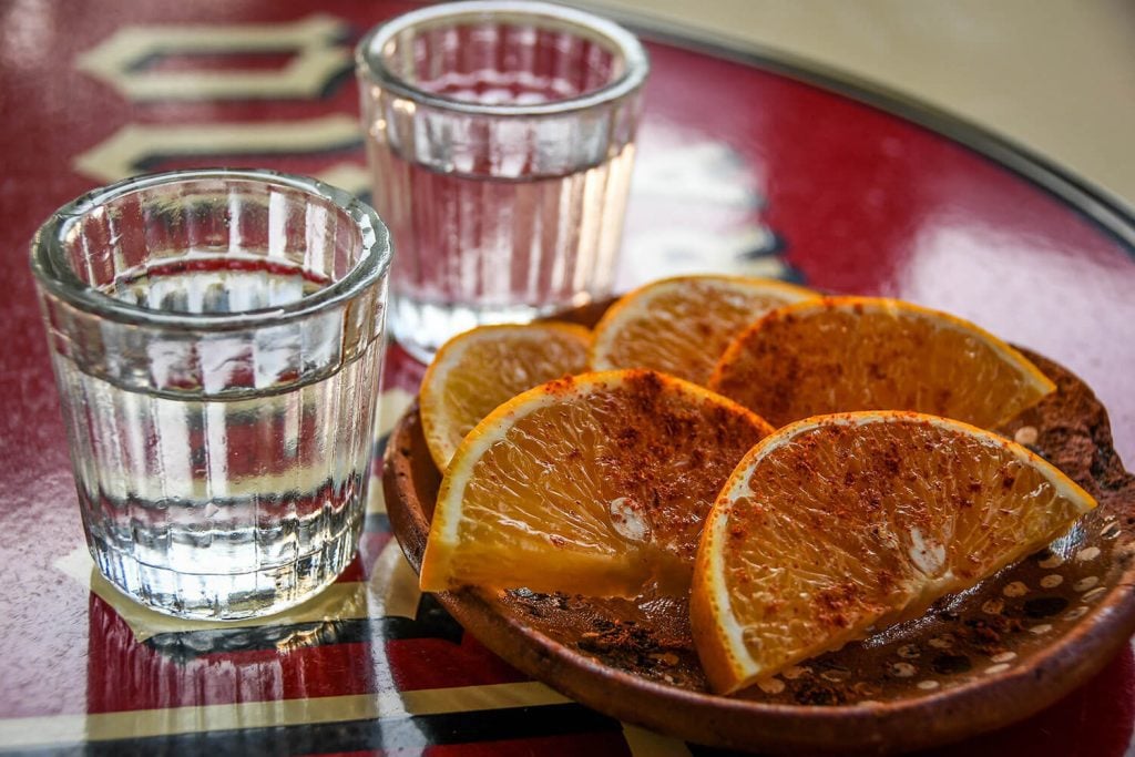 A distilled alcoholic beverage made from the agave plant, mezcal is a close relative to tequila and a much favored drink in Mexico. With its strong, smokey flavor profile, mezcal is typically consumed straight alongside a slice of orange and sal de gusano or worm salt.
